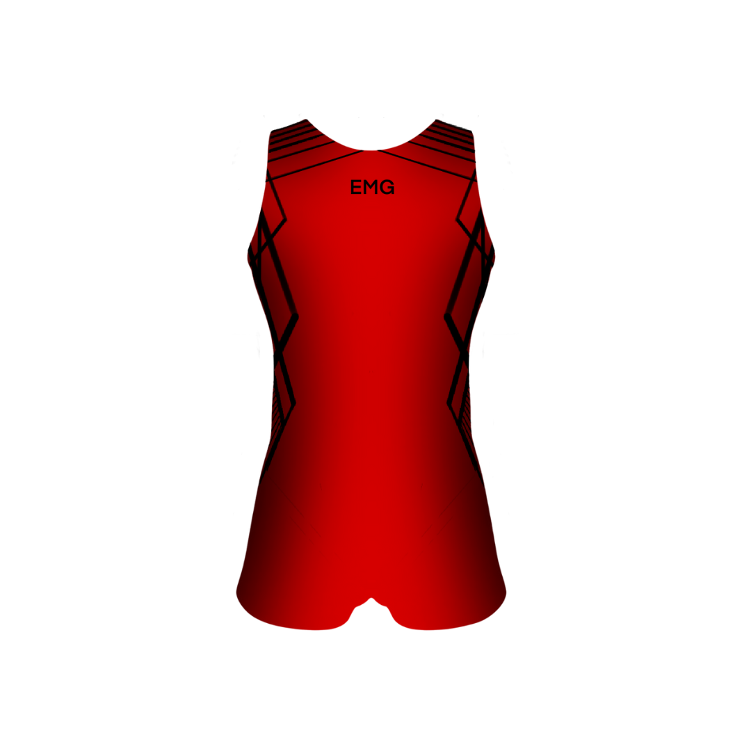 This Sonic Fitness boys leotard showcases a red and black sublimated print lycra leotard with a geometric panel design.